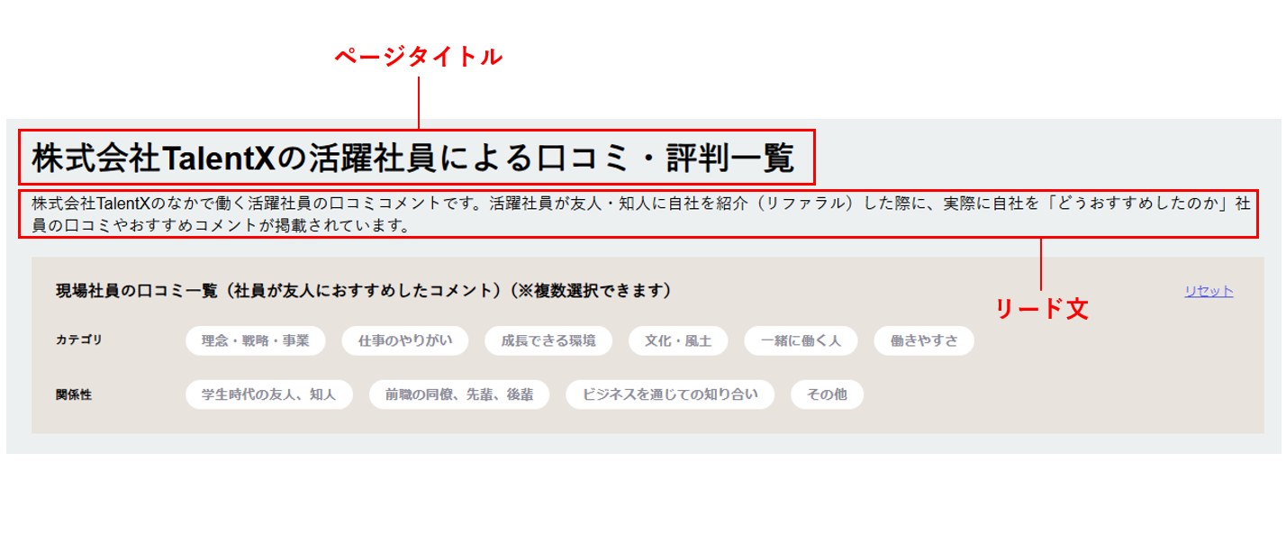 | 社員口コミリード文 | ページタイトルの下に表示される、リード文設定を行う。 |
