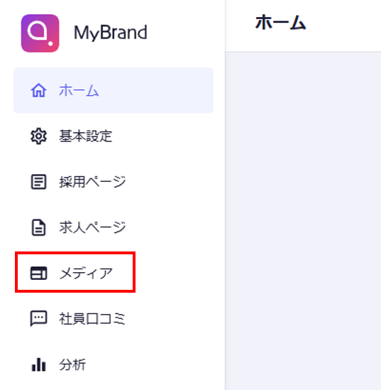 ①MyBrand管理画面より、「メディア」をクリック。