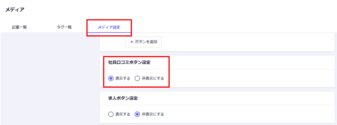 ②メディア設定内の社員口コミボタン設定で、「表示する」をクリック。